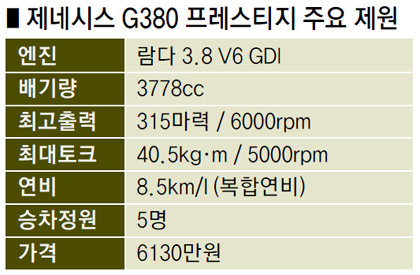 국산 중형 혹은 준대형 세단을 타왔던 운전자라면 제네시스의 실내외 디자인과 풍부한 옵션이 주는 감성 만족도는 매우 높을 것이다. 시승 모델은 GH380 프레스티지(풀옵션)였는데 프라임 가죽시트의 고급스런 질감과 편안함, 고가의 가구에나 사용된다는 오픈포어 리얼우드로 장신된 센터페시아가 주는 럭셔리한 느낌은 그 동안 국산차에서는 느낄 수 없었던 만족감을 선사했다. 개인적으로 실내 디자인과 풍부한 옵션이 주는 편리함만큼은 1억원대의 프리미엄 수입차에서나 누릴 수 있는 것들이라는 생각이다.