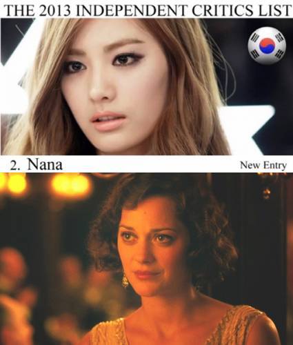 그룹 애프터스쿨의 나나가 프랑스 배우 마리옹 꼬띠아르에 이어 ‘2013 세계에서 가장 아름다운 얼굴 100인’ 2위에 올랐다.