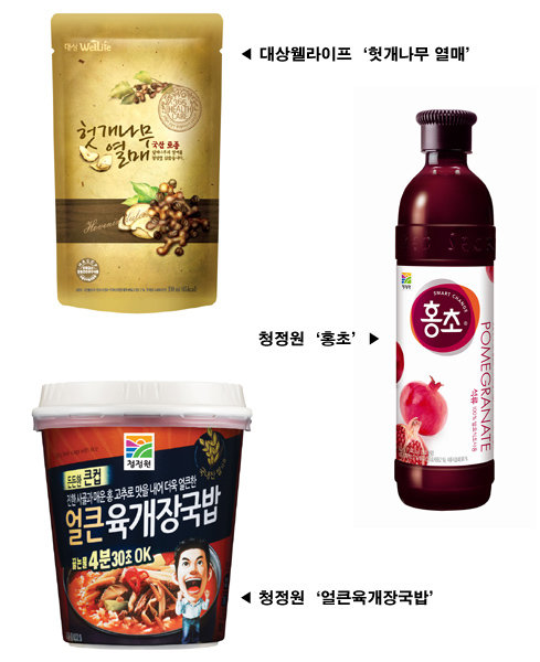 숙취 음료로 인기를 끌고 있는 헛개 음료는 혈중 알코올 농도를 낮춰주며, 숙취에 의한 갈증을 풀어준다. 대상웰라이프 녹즙은 ‘헛개나무 열매’를 판매 중이다. 국산 토종 헛개나무와 열매를 사용했으며, 오리나무, 오미자, 복분자 등을 함께 담았다. CJ제일제당은 여성용 숙취해소 음료 ‘컨디션 레이디’를 출시했다. 헛개컨디션의 주요 성분에 피부 보습에 좋은 히알루론산 성분을 추가했다. 이 밖에도 광동제약는 ‘힘찬하루 헛개차’, 롯데칠성음료는 ‘오늘의 차 아침헛개’ 등 헛개음료를 선보이고 있다.