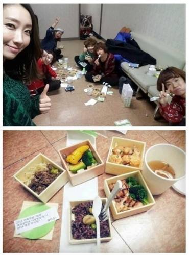 사진에는 KBS ‘개그콘서트’ 개그우먼들이 대기실에서 도시락을 먹고 있는 모습이 담겨 있다. 푸짐한 5단 도시락이 눈길을 사로잡는다.