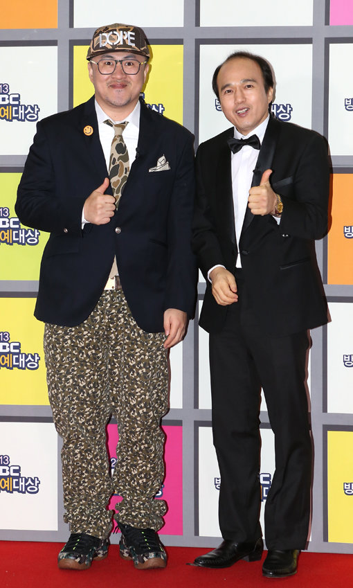 가수 데프콘(왼쪽), 배우 김광규가 29일 오후 서울 영등포구 여의도 MBC 공개홀에서 열린 ‘2013 MBC 연예대상’ 레드카펫 행사에서 포토타임을 하고있다.