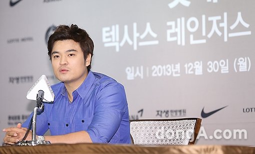 텍사스 레인저스와 7년 1억 3000만달러에 계약한 추신수 선수가 30일 오후 소공동 롯데호텔에서 열린 기자회견에 참석해 취재진의 질문에 답하고 있다.