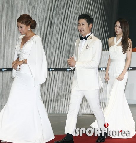 배우 김원희, 개그맨 신동엽, 에프엑스 크리스탈이 30일 오후 서울 마포구 상암동 SBS 프리즘센터에서 열린 ‘2013 SBS 연예대상 시상식’에 참석하고 있다.