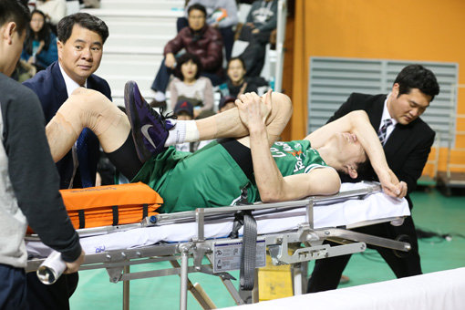 동부 김주성이 1일 원주에서 열린 LG와의 홈경기 도중 발목 부상을 당한 뒤 고통스러운 표정 속에 들것으로 실려 나가고 있다. 사진제공|KBL