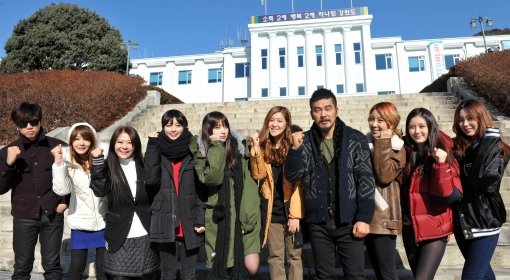 김영호 솔비 등 스타 재능 기부 프로그램 ‘DNA코리아’의 출연진들이 강원도청 앞에서 출정식을 하면서 화이팅을 외치고 있다.