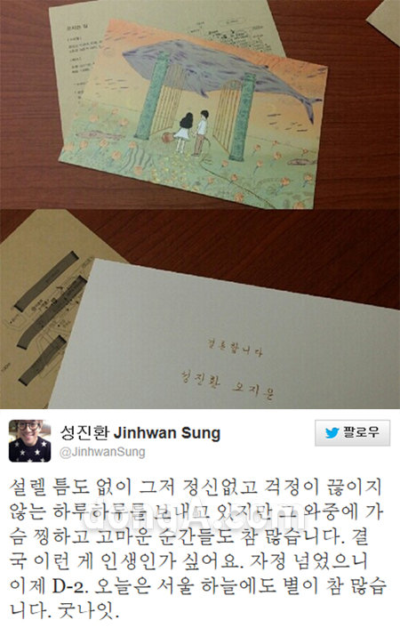 성진환은 2일 자신의 트위터 계정을 통해 “설렐 틈도 없이 그저 정신없고 걱정이 끊이지 않는 하루하루를 보내고 있지만, 그 와중에 가슴 찡하고 고마운 순간들도 참 많습니다”라고 글을 남겼다.