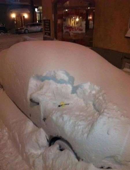 공개된 사진에는 폭설에 파묻힌 차량의 모습이 담겨 있다. 특이한 건 차 유리 부분에 붙은 주차 딱지. 많은 눈 사이에 있는 주차딱지가 이채롭다.