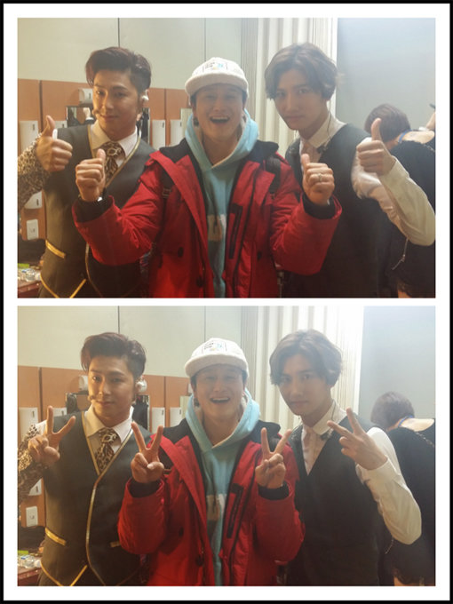 공개된 사진에는 카메라를 포즈를 취하는 김원효와 동방신기의 모습이 담겨 있다. 세 사람은 엄지를 치켜드는가 하면 브이를 그리며 다정한 모습을 취하고 있다. 동방신기는 이날 KBS 2TV ‘뮤직뱅크’를 통해 신곡 ‘Something’으로 컴백한다.