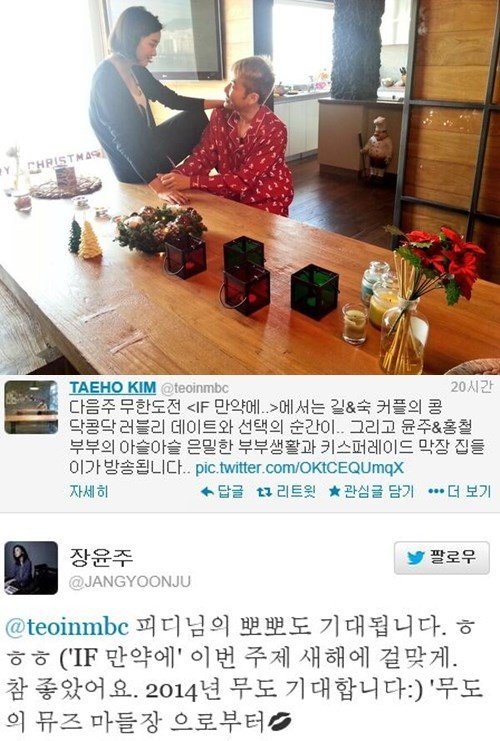 이는 지난 4일 ‘무한도전-만약에’편 방송 후 ‘무한도전’ PD인 김태호가 자신의 트위터를 통해 “다음 주 무한도전에서는 길&숙 커플의 콩닥콩닥 러블리 데이트와 선택의 순간이. 그리고 윤주&홍철 부부의 아슬아슬 은밀한 부부생활과 키스퍼레이드 막장 집들이가 방송됩니다”라는 예고에 대한 언급인 것.