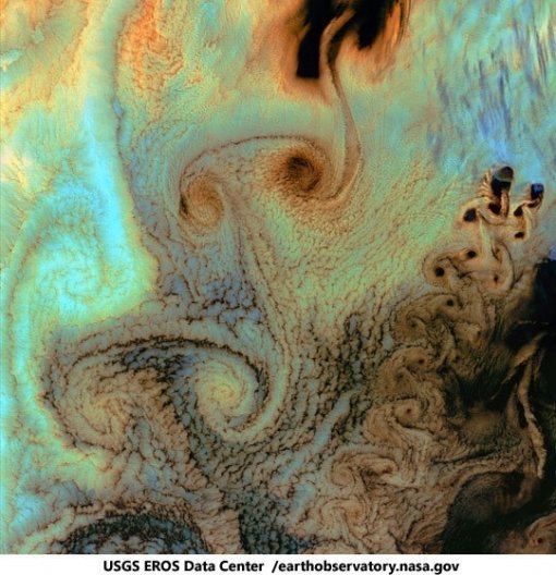 구름 소용돌이는 통상 강물 등 액체에서 나타나는 현상이지만 빠른 속도의 바람이 섬 같은 물체에 부딪혀 위로 솟거나 우회하면서 지구 대기에서 소용돌이가 발생하기도 하는 것으로 알려졌다.