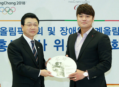 메이저리거 추신수(오른쪽)가 6일 서울 프레스센터에서 열린 ‘2018평창동계올림픽대회 홍보대사 위촉식’에 참석해 위촉패를 들고 기념촬영에 임하고 있다. 왼쪽은 김진선 평창동계올림픽조직위원장. 사진제공|스포츠코리아