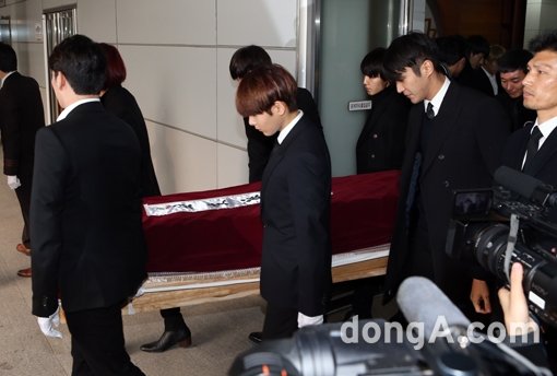 그룹 슈퍼주니어가 8일 오전 서울 구로구 고려대학교 구로병원 장례식장에서 열린 멤버 이특의 부친, 조부모상 발인식에 참석해 운구를 옮기고 있다.