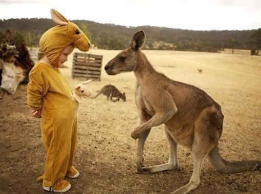 사진에는 캥거루 복장의 아이가 실제 캥거루와 마주 보고 있는 모습이 담겨 있다. 캥거루는 아이를 보고 혼란에 빠진 듯 묘한 표정을 짓고 있다.