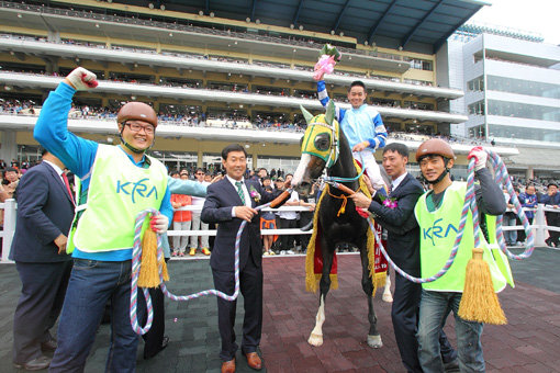 2013년 5월 코리안 더비에서 수말들을 제치고 우승한 ‘스피디퍼스트’의 시상식. 이 우승에 힘입어 그해 최우수 3세 암말에 선정되었고 올해 미국 경마 우승에 도전한다. 사진제공|한국마사회