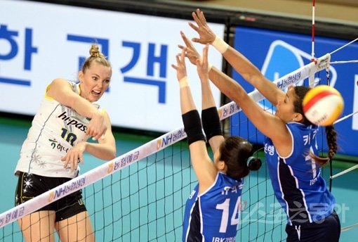 도로공사 니콜(왼쪽)이 9일 화성종합실내체육관에서 열린 IBK기업은행과 V리그 3라운드에서 상대 블로킹 사이로 강 스파이크를 때리고 있다. 화성|김민성 기자 marineboy@donga.com 트위터@bluemarine007