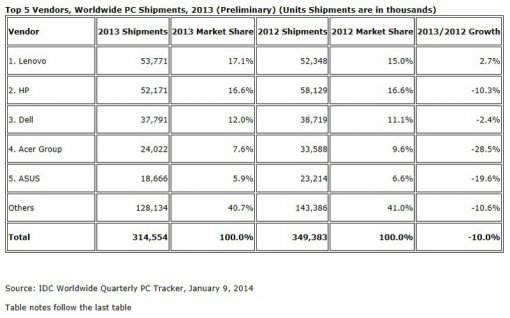 시장조사기관 IDC가 발표한 자료에 따르면, 2013년 4분기 전세계 PC 출하량은 8,221만 1,000대로 2012년 4분기 출하량 8,704만 9,000대에서 5.6% 하락했다. 2013년 전체 출하량은 3억 1,455만 4,000대로 2012년 3억 4938만 3,000대에서 10% 가량 하락했다. 가트너가 발표한 자료도 크게 다르지 않다. 가트너가 발표한 자료에 따르면, 2013년 4분기 전세계 PC 출하량은 8,263만 3,610대로 2012년 4분기 출하량 8,872만 7,923대에서 6.9% 하락했다. 2013년 전체 출하량은 3억 1,596만 7,516대로 2012년 3억 5,105만 9,698대에서 10% 가량 하락했다.