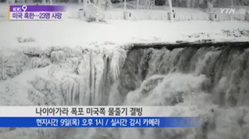 해외 언론들은 얼음투성이인 나이아가라 폭포의 사진을 공개하며 "미국 쪽으로 향하는 3개의 물줄기가 얼어버렸다"고 전했다.