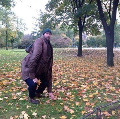 사진에는 한 남성이 공원을 배경으로 포즈를 취한 모습이 담겨 있다. 남성은 바닥에 쌓인 낙엽을 줍고 있다. 하지만 이 남성의 팔과 허리가 비정상적으로 길어 의문을 자아낸다.