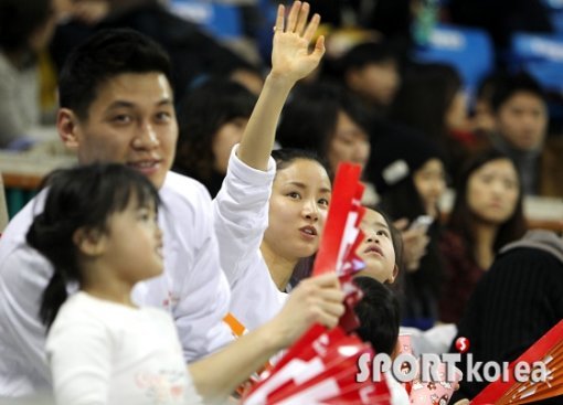 11일 오후 잠실학생체육관에서 열린 ‘2013-2014 프로농구’ 서울 SK와 부산 KT의 경기에서 펜싱국가대표 선수들이 경기를 관전했다. 미녀검객 남현희가 전광판에 자신의 모습이 비쳐지자 손을 흔들고 있다.