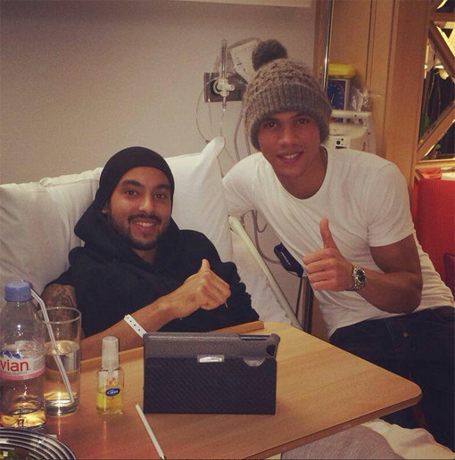 잉글랜드 프리미어리그(EPL) 아스널 수비수 키어런 깁스(24)가 부상 중인 동료 시오 월콧(24)을 찾았다.