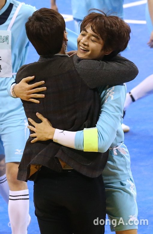 샤이니의 멤버 민호가 13일 오전 서울 송파구 학생체육관에서 열린 MBC 설특집 프로그램 ‘아이돌스타 육상·양궁·풋살·컬링 선수권대회’에서 송종국 해설위원과 포옹을 하고있다.