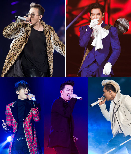 13일 일본 오사카 교세라돔에서 6개 돔 투어의 피날레를 장식한 빅뱅은 ‘따로 또 같이’ 하는 무대로 각자의 매력과 환상의 팀워크를 자랑했다. 사진은 솔로 무대에서 매력을 폭발시킨 멤버 지드래곤, 탑, 태양, 승리, 대성.(왼쪽 위부터 시계방향으로) 사진제공|YG엔터테인먼트