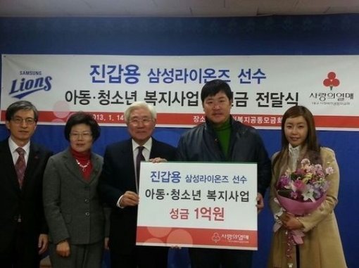 삼성 맏형인 포수 진갑용이 나눔의 정신을 이어받으며 사회복지시설에 1억 원을 기부했다. 진갑용은 14일 오전 대구 사회복지공동모금회 사무실에서 조해녕 회장에게 기부금 1억원을 전달했다.
