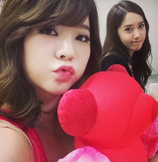 공개된 사진에는 써니가 빨간 곰을 끌어 안고 입술을 내미는 모습과 그 뒤에서 뾰로통한 표정을 짓는 윤아의 모습이 담겨 있다.