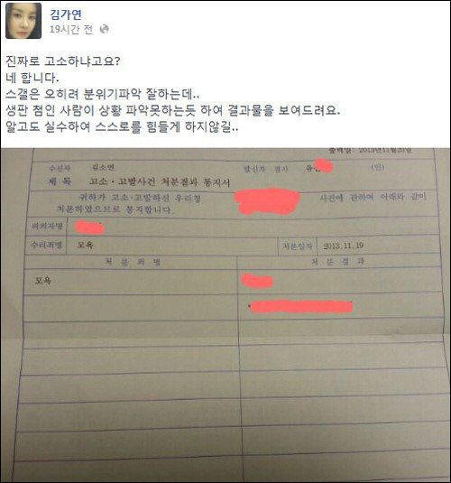 김가연이 공개한 사진속에는 그녀의 본명(김소연)과 함께 사건을 담당하게 될 검사와 처분 일자가 공개돼 있다. 특히 처분 죄명에는 ‘모욕’이라고 적혀있다.