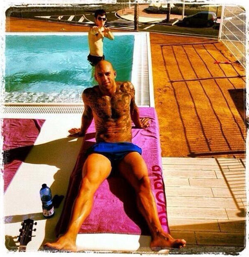 사진 속 하워드는 문신이 가득한 상체를 드러낸 채 일광욕을 즐기고 있다. 그 뒤에는 선글라스를 쓴 베인스가 수영장 안에서 카메라를 향해 포즈를 취하고 있어 눈길을 끌었다.