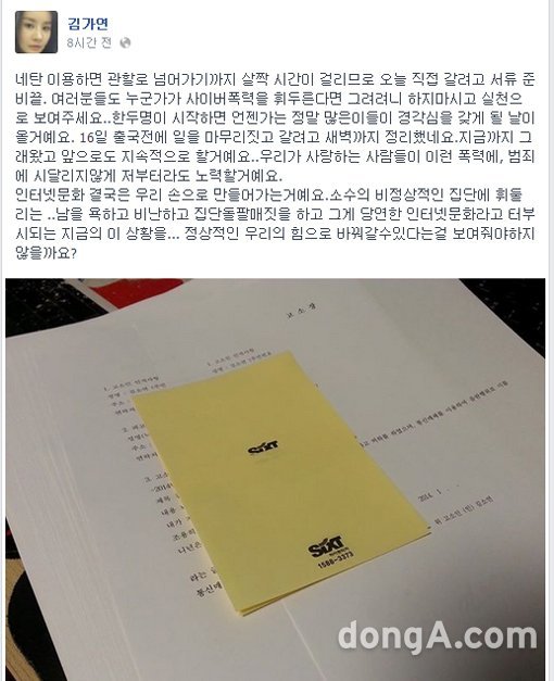 김가연은 15일 자신의 페이스북 계정을 통해 “네탄(사이버테러대응센터) 이용하면 관할로 넘어가기까지 살짝 시간이 걸리니 오늘 직접 갈려고 서류 준비 끝. 여러분들도 누군가가 사이버폭력을 휘두른다면 그러려니 하지 마시고 실천으로 보여주세요”라고 글을 남겼다.