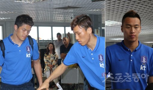 대표팀 주전 골키퍼 자리를 놓고 치열하게 경쟁할 것으로 보이는 정성룡(왼쪽)과 김승규가 15일(한국시간) 이구아수 공항에 도착해 짐을 찾고 있다.(왼쪽 사진) 공격수 김신욱이 비장한 표정으로 출국장을 빠져나가고 있다. 이구아수(브라질)|남장현 기자