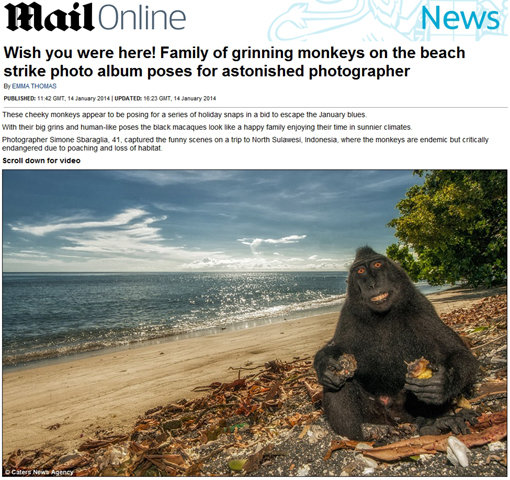보도에 따르면, 이탈리아 사진작가 시몬 스바라길라(41)는 인도네시아 술라웨시 섬에서 서식하는 검정짧은꼬리원숭이를 촬영했다.