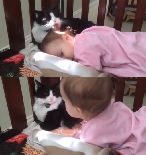 고양이는 아기가 엎드리면 다시 머리를 핥았고, 아기가 일어나면 다시 모른 체 했다.