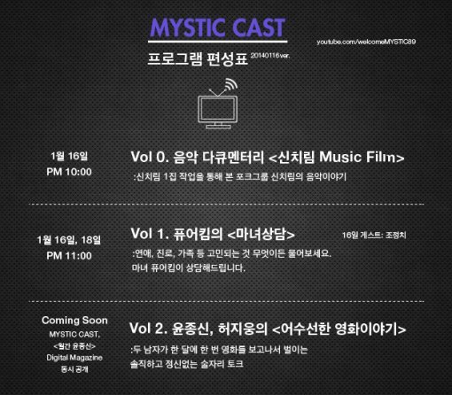 이날 신치림 1집 작업을 중심으로 한 포크그룹 신치림의 음악 이야기를 다룬 ‘Vol 0. 음악 다큐멘터리 <신치림 Music Film>’ 방송이 끝난 후 11시부터는 ‘연애’, ‘진로’, ‘가족’ 등 시청자의 고민을 직접 상담해주는 ‘Vol 1. 퓨어킴의 <마녀상담>’이 생방송으로 진행된다.