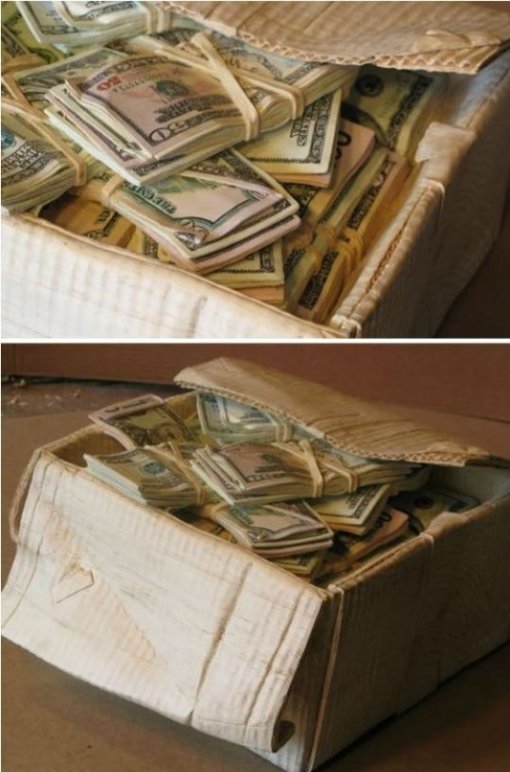 공개된 사진에는 종이 상자 안에 다량의 지폐 다발이 담겨 있는 모습이 보인다. 이 돈다발은 미국의 조각가 렌달 로젠탈이 큰 나무를 직접 깎아 만든 것으로 알려져 보는 이들에게 놀라움을 안겼다.