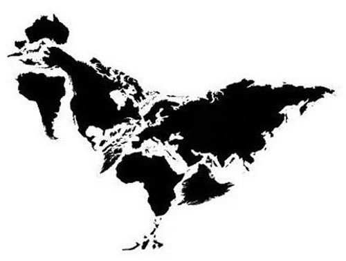 해당 사진은 세계 7대륙을 닭 모양으로 재배치한 것이다. 닭의 머리는 남아메리카와 호주 대륙에 해당한다.