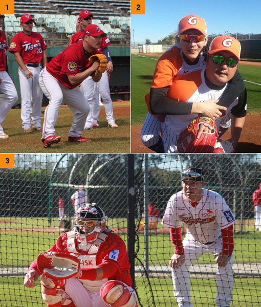 1. ‘올해는 마운드 왕국 재건의 해!’ KIA 김진우(앞)가 스프링캠프가 차려진 괌에서 동료투수들과 함께 수비훈련을 하고 있다. 2. ‘홀쭉이와 뚱뚱이의 합체?’ 지난해 FA 자격을 얻어 친정팀에 돌아간 롯데 최준석(앞)이 전지훈련지인 미국 애리조나 서프라이즈에서 박기혁을 업고 포즈를 취하고 있다. 3. ‘볼이 얼마나 좋나 한번 볼까?’ SK 이만수 감독(뒤)이 미국 플로리다 베로비치에서 새 외국인투수 로스 울프의 피칭을 포수 뒤에서 진지한 표정으로 지켜보고 있다. 사진제공|KIA 타이거즈·롯데 자이언츠·SK 와이번스