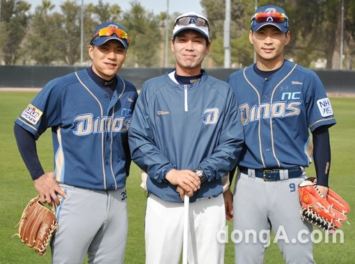 NC 다이노스의 이종욱, 전준호 주루코치, 김종호(왼쪽부터) 19일(현지시간) 미국 애리조나 투산의 NC 전지훈련장에서 포즈를 취하고 있다.