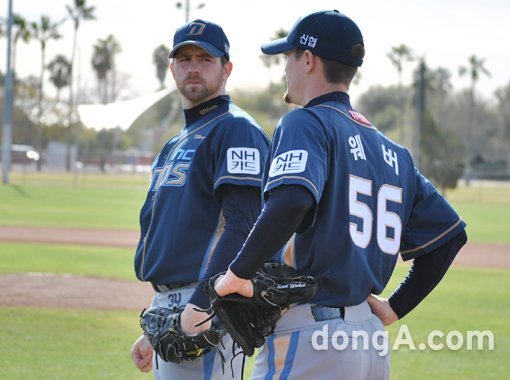 NC 다이노스의 외국인 투수들인 에릭 해커(왼쪽)와 태드 웨버가 19일(현지시간) 미국 애리조나 투산의 NC 전지훈련장에서 얘기를 나누고 있다.