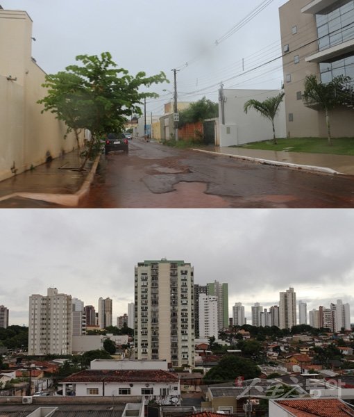 쿠이아바를 찾은 22일(한국시간) 천둥과 번개를 동반한 뇌우가 쏟아졌다. 배수가 잘 안 돼 도로에 시뻘건 흙탕물이 쏟아지는 모습(위쪽 사진). 을씨년스런 분위기가 풍기는 쿠이아바 시내 전경. 쿠이아바(브라질)|남장현 기자