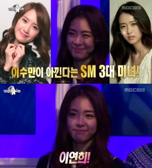 이날 방송에서 MC들은 배우 이연희의 등장을 알리며 “이수만이 아끼는 SM 3대 미녀”라고 소개다. MC들이 언급한 ‘SM 3대 미녀’에는 이연희와 함께 소녀시대 윤아와 고아라가 포함됐다.
