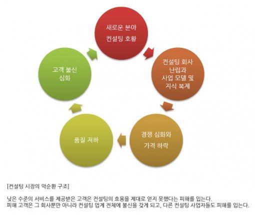둘째로, 한국에서는 컨설팅 회사의 ‘지적 자산(Intellectual Property)’이 그다지 잘 보호받지 못하고 있다. 일부 업체들은 합법과 불법의 경계를 넘나들며 선도 기업의 지식을 복사하고 흉내낸다. 이로 인해 컨설팅 비용은 낮아지지만, 고객들은 더욱 큰 피해를 입게 된다. 그리고 피해 고객들은 컨설팅 회사를 불신하게 된다.