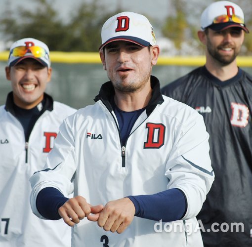 동아닷컴 취재진이 미국 애리조나에 위치한 두산의 스프링캠프를 찾은 22일(현지시간) 오전, 칸투는 크리스 볼스테드(28), 더스틴 니퍼트(33)와 함께 훈련장에 도착했다.