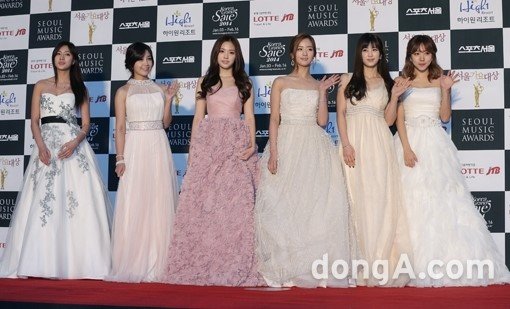 사진은 에이핑크 멤버들의 포토타임을 모습. 평소와 달리 드레스를 차려 입은 에이핑크는 여성스런 모습으로 플래시 세례를 받았다.