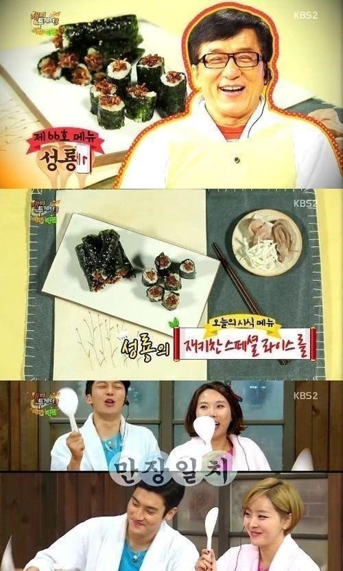 이날 방송에서 성룡은 과거 영화 촬영 중 한국인 스태프에게 얻은 김과 고추장을 이용해 만든 야식을 소개했다. 그는 다진 소고기와 오징어채 등을 고추장과 함께 볶았다. 이후 이 재료를 김으로 싸 완성했다.