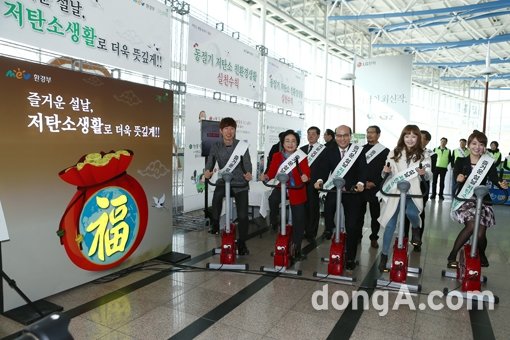 개그맨 양상국(왼쪽부터), 김재욱 상임대표, 정연만 차관, 배우 전소민, 기상캐스터 김혜선이가 27일 오전 서울 용산구 서울역에서 열린 ‘저탄소설명절 보내기 캠페인’ 행사에서 자가발전자전거를 타고 있다.