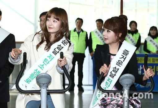배우 전소민(왼쪽), 기상캐스터 김혜선이 27일 오전 서울 용산구 서울역에서 열린 ‘저탄소설명절 보내기 캠페인’ 행사에서 자가발전자전거를 타고 있다.