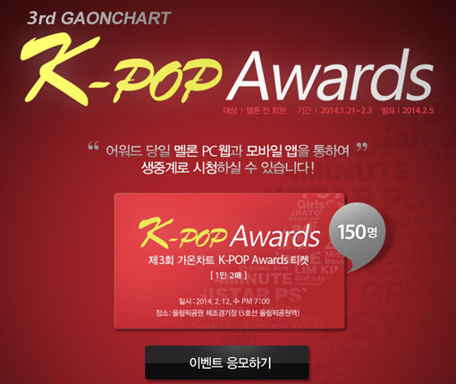 이번 이벤트는 멜론 모든 회원을 대상으로 하며, 오는 2월 3일까지 멜론 이벤트 페이지를 통해 신청 할 수 있다. 이벤트 응모자 중 추첨을 통해 총 300명에게 ‘제3회 가온차트 K-POP 어워드’ 티켓을 증정한다. 당첨자는 2월 5일 멜론 홈페이지를 통해 확인할 수 있다.