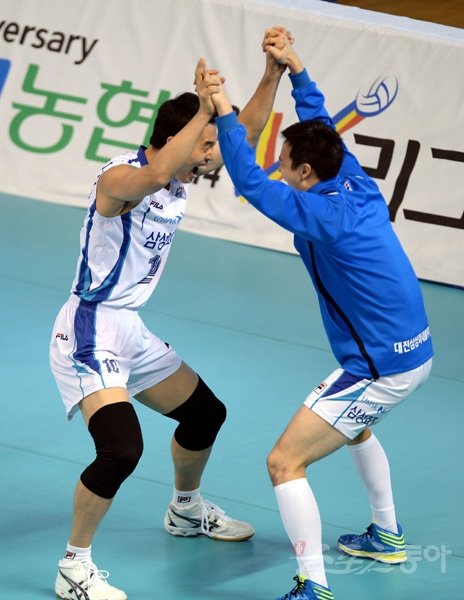 삼성화재-대한항공의 2-2 트레이드 결과가 나왔다. 류윤식 황동일을 데려간 삼성화재는 현대캐피탈 우리카드를 상대로 2연승을 했다. 대한항공도 LIG손해보험에 3-0 승리를 거뒀다. 신치용 감독은 22일 현대캐피탈을 이기고 1위에 복귀한 뒤 싱글벙글 했다. 트레이드 덕분에 새로운 볼거리도 생겼다. 끼 많은 황동일이 고희진과 함께하는 2인1조 댄스 세리머니가 탄생했다. 26일 우리카드전에서 1세트 막판 득점에 성공한 황동일은 웜업 존의 고희진에게 뛰어가 야릇한 댄스를 함께 췄다. 고희진도 화답해 몇 차례 더 듀엣 댄스 세리머니를 했다. 팬들의 반응은 좋았다.